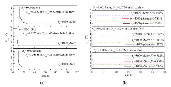 The four channel outputs of the water holdup sensor to three typical flow patterns with different water conductivities are shown in Figure 6a–c. As seen, the output signals of four channels present slight differences due to the non-uniform phase distribution of two-phase flows. For slug flow, the output signals of liquid slugs present high voltage, and the output signals of Taylor bubbles present low voltage. For bubble flow, the output signals present high voltage with small and high frequency fluctuation, which are similar with the signals of liquid slug in slug flow. The signals of churn flow are similar to slug flow, but the frequency of fluctuation is high. The increase of the water conductivity increases the outputs of the sensor, and the resolution of the sensor to conductivity variation caused by water holdup is not affected. The performance of the water conductivity sensor to water conductivity measurement in gas-water two-phase flow is shown in Figure 7. Figure 7a presents the responses of the water conductivity sensor to the water conductivity changes (from 8000 to 1000 ) under different flow patterns. As seen, the water conductivity sensor has good capability in tracking the water conductivity change under different flow patterns. The outputs of the sensor under different flow patterns and water conductivities are shown in Figure 7b. It can be seen that water conductivity sensor has stable outputs and a small relative error E of conductivity measurement.