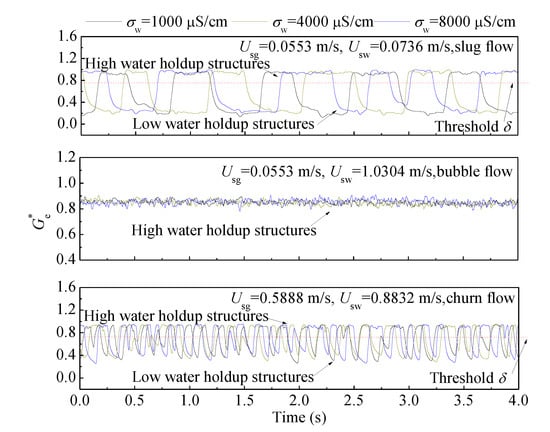 As the water conductivity can be obtained, the of three typical flow patterns can be calculated using Equations (12) and (13), and the fluctuations of under different water conductivities are shown in Figure 8. It can be seen that is not affected by the change of water conductivity, and it only reflects the fluctuation of the water holdup. To deduce the water holdup from , valid models need to be established. As seen in Figure 5, different flow patterns have different flow structures. For bubble flow, only bubbles with a small size are randomly distributed in the liquid phase, and these high water holdup structures are effectively reflected by in Figure 8. For slug flow and churn flow, the high-level parts of signals correspond to the high water holdup structures, which are liquid slugs in slug and churn flows. These flow structures are similar to bubble flow. The low-level parts of signals correspond to the low water holdup structures, which are Taylor bubbles in slug and large gas structures in churn flows. Since the low water holdup structures and the high water holdup structures are very different, the water holdup measurement models for each of them will be different. Therefore, accurate classification of different flow structures, obtaining the signals of different flow structures through a suitable threshold, and establishing the valid measurement models are the keys to accurately obtaining water holdup.