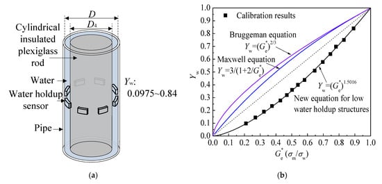 In order to evaluate the performance of the Maxwell equation and Bruggemann equation in water holdup measurement of low water holdup flow structures (Taylor bubbles of slug flow and large gas structures of churn flow), and to establish the valid water holdup measurement equation for these flow structures, we drew the curves of Equations (15) and (17) in Figure 9b. For the Taylor bubbles of slug flow and the large gas structures of churn flow, the shape of gas phase is similar to cylinder, and the conducting water exists between the gas structures and pipe wall. We simulated the gas structures with a cylindrical insulated plexiglass rod with a diameter D4 as shown in Figure 9a. The insulated plexiglass rod was placed in the center of the pipe, and the annular space between the insulated plexiglass rod and inner pipe wall was filled with water. By changing the diameter of the plexiglass rod, the of the sensor at different water holdup was obtained. Afterward, we present the water holdup under corresponding in Figure 9b. As seen, the Maxwell equation and Bruggemann equation are not suitable for measuring water holdup in low water holdup structures because the structures do not satisfy the assumption of the Maxwell equation and Bruggemann equation.