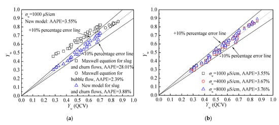 Figure 10a presents the calculation results using only the Maxwell equation and the new proposed model when the conductivity of water is 1000 . It can be seen that the Maxwell equation has a good measurement accuracy for bubble flow, but for slug flow and churn flow, the measurement error is very big because of their different flow structures. The new model greatly improves the accuracy of water holdup measurement in slug flow and churn flow, and satisfactory results are achieved. The absolute average percentage error (AAPE) of water holdup measurement in three flow patterns using the new model is 3.55%.