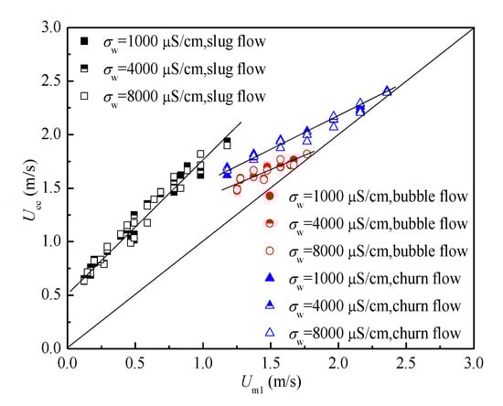 We investigated the relationships between Ucc and Um1 in Figure 12. As seen, Ucc are different with Um1 because of the influence of and . It is noteworthy that the Ucc has a nearly linear relationship with Um1 in the same flow pattern. Hence, the relationship between Um1 and Ucc is simplified because of the increased fluid velocity in the annular space. The change of water conductivity will not affect the calculation results of the cross-correlation velocity, so the relationships between the cross-correlation velocity and mixture velocity are similar under different water conductivity conditions. We used the relationship between Ucc and Um1 under the water conductivity of 1000 to build the model by the fitting method in Figure 12. Therefore, salinity independent mixture velocity measurement can be achieved.