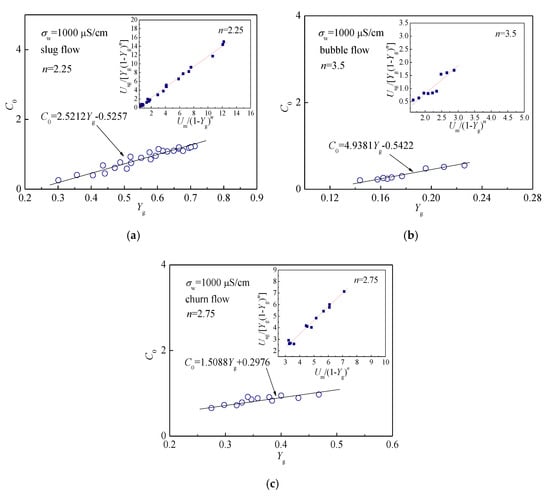 where Usg is the gas phase superficial velocity. Yg, Um, C0, and n are the gas holdup, mixture velocity, distribution parameter, and droplet size exponent in the 20 mm inner diameter pipe, respectively. The can be obtained according to []. To obtain the values of C0 and n, we investigated the relationships between and of different flow patterns in Figure 13 through setting different values of n in Equation (25). Because of the realization of salinity independent mixture velocity and water holdup measurement, in the process of model establishment, Um and Yg are the measurement results under the water conductivity of 1000 . For slug flow as shown in Figure 13a, when n = 2.25, the data points present a better linear relationship, and the value of n in slug flow is determined as 2.25. Using the same method, the values of n in bubble and churn flows are determined as 3.5 and 2.75, respectively. We regard that the values of C0 depend on Yg, and the relationship between C0 and Yg under different flow patterns are shown in Figure 13. Then, we obtained the relationship between them using the fitting method. Finally, we substituted the values of n and the relationships between C0 and Yg into Equation (25), and the expression of drift-flux model for gas-water two-phase flow was obtained.