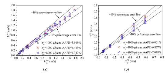 Then, we used the established models under the water conductivity of 1000 to predict the mixture velocity and gas phase superficial velocity under different water conductivities. The results are shown in Figure 14, and the prediction accuracy of flow velocities is satisfactory. Therefore, salinity independent mixture velocity and individual phase superficial velocity measurement can be realized. The results of three measurements with different water conductivities are all satisfactory, which reflect the good repeatability of the velocities’ measurement.