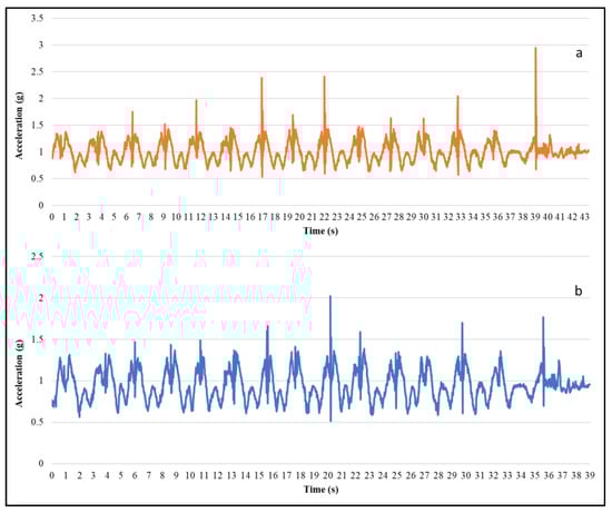 Acceleration magnitude while lifting using (a) conventional sensor and (b) armband sensor.