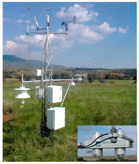 As the surface skin layer is in contact with both atmosphere and soil/vegetation, it is difficult to measure LST using traditional thermometers. The in situ LST is not directly measured, but estimated from surface brightness temperature (BT) derived using the amount of energy radiated by the surface, target emissivity and sky radiance derived from incoming longwave radiation or sky BT measurements to account for the upward reflected component of the downward radiation. Currently, there are three methods to obtain ground-based LST including the use of narrow angle broadband or multiband infrared radiometers or imagers, estimates from broadband infrared hemispheric fluxes, and using AT as a proxy for LST [,,,]. Contrary to the near surface AT, accurate ground-based LST measurements are not usually conducted globally as part of standard meteorological observations on a global basis. However, a few exceptions in the USA include BT measurements by narrow-angle IR thermometers (IRT) at the United States Climate Reference Network (USCRN, https://www.ncdc.noaa.gov/crn/) [] and LST data obtained from broadband infrared hemispheric fluxes measured by pyrgeometers at the Surface Radiation Network (SURFRAD, https://www.esrl.noaa.gov/gmd/grad/surfrad/) [,] mainly over grass surfaces. A similar method can be used to estimate LST over various land cover types using pyrgeometers at energy flux sites like FLUXNET (https://fluxnet.ornl.gov), where radiation measurements are usually available. Recent technical advancements led to the production of light weight forward looking infrared (FLIR) sensors in addition to low cost IR sensors. These FLIR cameras onboard aircraft or unmanned aerial vehicles (UAVs) can provide LST images over a larger area and are especially useful in campaign mode experiments compared to point measurements by IR sensors. The footprints of tower-based measurements are much smaller than those from infrared imagers or sensors on UAVs, aircraft or satellite-based sensors. However, it remains an evolving technique with limited resolution, accuracy, poor contrast, and low signal to noise ratios that needs to be fine-tuned to obtain higher accuracy of IRT’s. Even though all the IR sensors and imagers are factory calibrated, neither multiple sensors with a different field of view nor their field deployment, have been compared over a long duration.