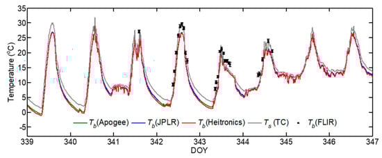 Comparison of 5-min surface brightness temperature (Tb) measurement during DOY 339 to 347 in 2015 using Apogee, Heitronics, and JPLR. For JPLR, the temperature measurements within calibation range from 4 to 40 °C only are shown. The mean LST (Ts) measured by thermocouples (TC) are shown by gray lines. The average and standard deviation of the forward looking infrared (FLIR) Tb measurements are shown by black squares and vertical bars, respectively.