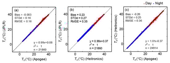 Comparison of 5-minute surface brightness temperature measurements (Tb) by IRT sensors—(a) JPLR vs. Apogee, (b) JPLR vs. Heitronics, and (c) Heitronics vs. Apogee during the campaign period. Mean bias, STDd, RMSE, and results of the linear regression analysis (solid line) for the whole dataset are shown. The dotted line indicates 1:1 relationship between the variables.