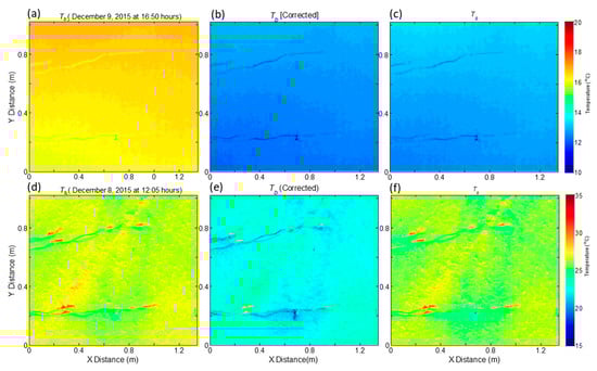 Spatial variability of brightness temperature (Tb) (a,d), corrected Tb (b,e) and LST (Ts) (c,f) in the FLIR camera footprint area with embedded thermocouples on 9 December, 16.50 hours and 8 December, 12.05 h, 2015.