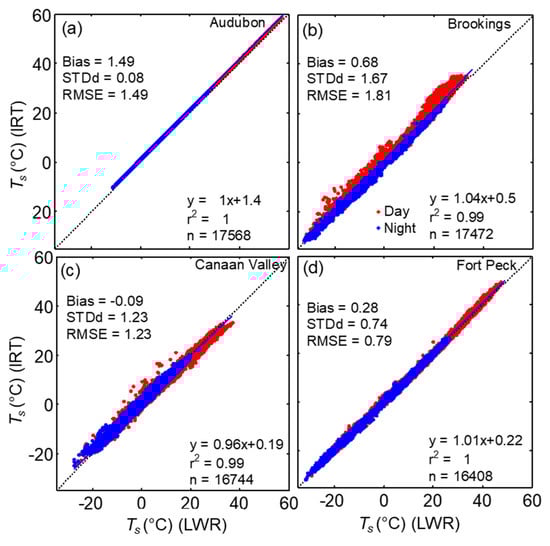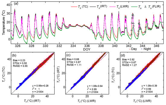 To evaluate how the LSTs measured by IRT’s, TC, and FLIR compare with those estimated from longwave radiation (LWR) measurements by CNR, the time series of LSTs are shown in Figure 5a and corresponding linear regression analysis is shown in Figure 5b–d. Here the mean values of the LST by the three IRTs were used. As mentioned above the surface temperature measured by IRT sensors and imagers are brightness temperatures rather than actual Ts. So, it must be corrected for surface emissivity and reflectivity effects to get the true estimates of Ts. During the experiment we noticed the effect of dew deposition on incoming longwave radiation measurements which appeared as a spike [], especially during early morning hours for a few days and these data points were removed leading to gaps in LSTs estimated using Equations (2) and (3). After the emissivity and reflectivity correction, the LSTs by IRTs, FLIR, and LWR agreed very well in magnitude with the direct measurements of Ts by TC with r2 > 0.99 (Figure 5 and Table 4). The difference between Ts (LWR) and other LST measurements were noticeable mainly during daytime. The mean bias (0.23 °C), STDd (0.50 °C), and RMSE (0.55 °C) from the comparison of Ts (TC) with mean Ts by IRTs was smaller than the bias and RMSE obtained using Ts (IRT) or Ts (TC) with Ts (LWR) (bias = 0.68, STDd = 0.87 RMSE = 1.11 °C; and bias = 0.92, STDd = 0.87 and RMSE = 1.27 °C), respectively. This clearly indicates that the higher biases between LST measurements were contributed by Ts (LWR). The bias, STDd, and RMSE between the LST measurements by the three methods were higher during daytime than those during nighttime (Table 4) because the Earth’s surface is more thermally homogeneous during nighttime []. Due to this, the absolute bias between nighttime Ts measurements by the three methods above resulted in a value <0.5 °C, anticipated accuracy for ground-based LST measurements.