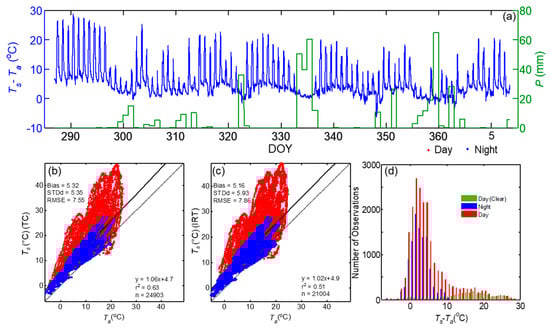(a) Times series of the difference between mean LSTs by IRTs (Ts) and mean air temperature (AT) by platinum resistance thermometers (PRTs) and daily total precipitation (P) during the campaign period, comparison of 5-min mean LST measurement by (b) thermocouples and (c) IRTs vs. air temperature (Ta). Histogram of the difference between LST (IRT) and AT for different periods are also shown (d).