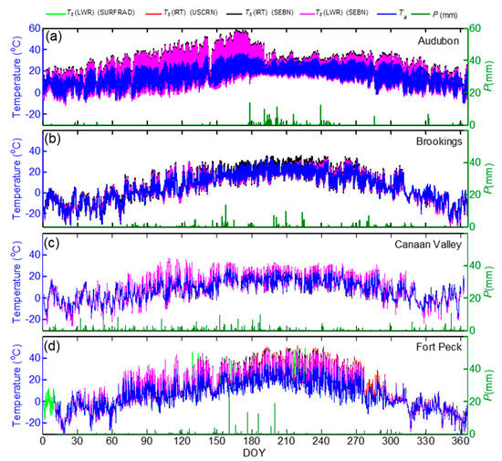 Time series of 30-min air temperature (Ta), precipitation (P), and land surface temperature (Ts) by IRT and LWR measurements at the SEBN sites. LST measurements from the nearby United States (a–d) Climate Reference Network (USCRN) and (Surface Radiation Network) SURFRAD sites are included on panel 4 for the Fort Peck site.