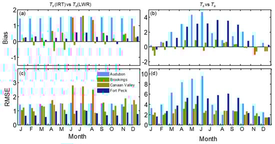 Monthly values of bias and root mean square error (RMSE) for Ts (IRT) vs. Ts (LWR) (a,c); and Ts (IRT) Ta (b,d), respectively for the four grassland sites.