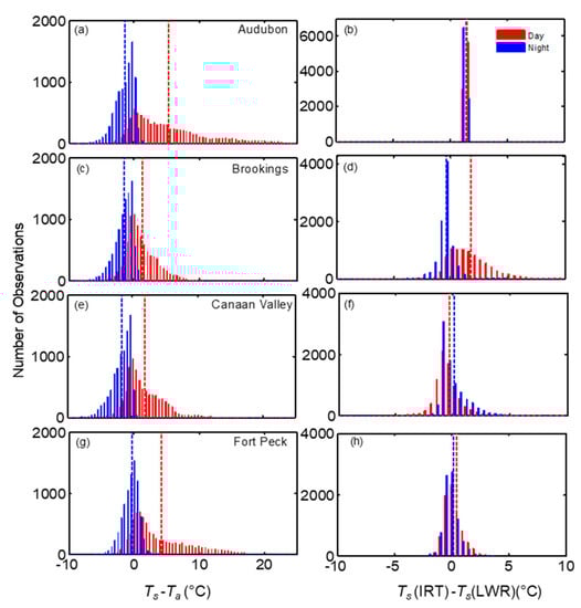 To explore further on how the relationship between LST measurements vary seasonally, the results of monthly statistics are shown in Figure 9a,c. The magnitudes of Ts (IRT) were higher than Ts (LWR) for all sites except Canaan Valley. The monthly bias showed a transition during the beginning and end of the growing season in spring (April–May) and November, respectively, at this site. The bias and RMSE obtained from the comparison of Ts (IRT) and Ts (LWR), indicated strong seasonal variation at Brookings and Fort Peck. In these sites, bias was higher during the peak growing season from June to August when the vegetation growth reached its highest of the season [,]. The bias and RMSE at the Brookings were 1.6 and 2.7 °C in August, whereas at Fort Peck it was >0.55 °C and ~1 °C in June and July, respectively. However, at Canaan Valley, the absolute difference between Ts (IRT) and Ts (LWR) was lower than 0.58 °C throughout the year with lower values of RMSE during May to September. At Audubon semiarid grassland, the bias and RMSE were consistently high throughout the year (both > 1.4 °C), with slightly higher values (>1.52 °C) during May–September. However, monthly values of STDd (not shown here) from the comparison of Ts (IRT) and Ts (LWR) were lower than <0.09 °C during the year at the Audubon site, whereas it varied from 0.5 to 2.3 °C for the other sites. However, the distribution of the difference between half-hourly daytime Ts (IRT) and Ts (LWR) in Figure 9 indicates a large difference, exceeding 5 °C during daytime in Brookings followed by Canaan Valley whereas in the other three sites it was mostly less than 2 °C.