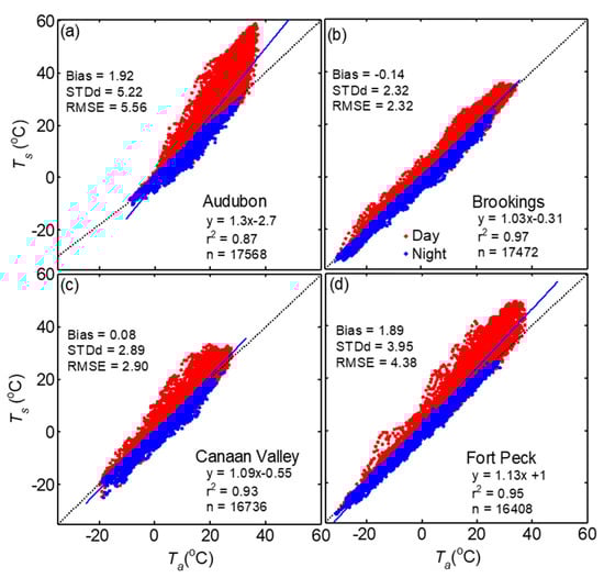 Among the four sites, the magnitudes of daytime half hourly Ts-Ta at the Audubon site reached up to 25 °C followed by Fort Peck and Canaan Valley (<20 °C) (Figure 7 and Figure 10), whereas during nighttime Ts was mostly lower than Ta by <5 °C. The difference between Ts and Ta for annual dataset was highest at Fort Peck (1.9 °C) and Audubon (1.9 °C) with RMSE 4.38 and 5.56 °C, respectively (Figure 11 and Table 6). At Canaan Valley and Brookings, the bias was 0.08 and 0.14 °C, respectively. The RMSE between Ts and Ta were among the highest at Audubon and Fort Peck during daytime conditions, but it was the highest at Brookings and Canaan Valley during nighttime periods. However, on a monthly basis, all sites showed distinct patterns (Figure 9b,d), but mostly with larger Ts-Ta values during peak summer months. At the Audubon site Ts-Ta and RMSE reached its peak values in June (4.7 and 9 °C, respectively), and these values reduced drastically by July following the onset of North American monsoon season (Figure 7a) and increase in vegetative activity []. The bias and RMSE between Ts and Ta at Fort Peck were consistently above 2.9 and 5.0 °C, respectively, during May to September. Whereas at Brookings, both Ts and Ta agreed well during most of the year (Figure 7b), especially during June to September compared with other sites with monthly absolute bias < 0.5 and RMSE < 2.7 °C, but higher values during spring and fall months. The bias was <1 °C at Canaan valley but RMSE reached values close to 4 °C during June to July. As expected, Ta was mostly higher than Ts during winter months.