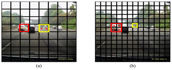 The YOLO [16] system splits the input image into grid boxes in order to detect the larger objects. The graphical demonstration of this case in a real driving environment is as shown in Figure 3a. The grid annotated in red is an example of the grid containing larger objects and the yellow grid denotes the smaller objects. It can be observed that when the objects are small and located near to each other, one grid box can be filled with more than one object as in the yellow grid. This results in detection degradation when there are many tiny objects in the training database. The BBRs permit the detection of only one object in each grid box, which would make ambiguous back-propagation in the training stage. For example, in Figure 3a, the object B in the yellow box would be treated as background because the object A has a slightly larger bounding box compared to the object B. However, in human perception, the feature of the object B is undoubtedly a car. As a result, the model would produce an imprecise and low confidence score for these types of objects, which in turn leads to lower recall rate and mAP in the detection stage.