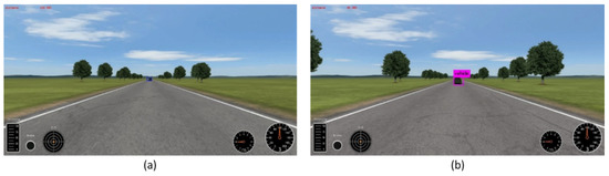 Detection results on CarSim simulation software. (a) the result of the proposed model, detecting a vehicle 124 m (intersection over union (IoU) > 0.5) and 200 m (IoU > 0.3) away. (b) the result of YOLOv2, detecting the vehicle within 45 m (IoU > 0.5).