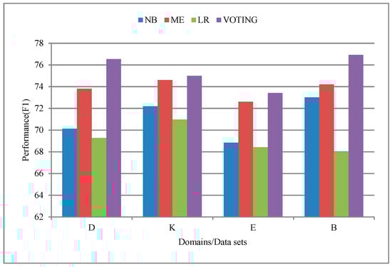 The first set of experiments is to evaluate Supervised Cross-Lingual Learning sentiment analysis (SCLL). This means that these experiments use only translated data for the training process. Initially, LR, NB, and ME and voting ensemble classifiers are trained using translated data from English and Arabic dataset. The experimental results using LR, NB, ME, classifiers voting ensemble on Books B, DVDs D, Electronics E, and Kitchen Appliances K are summarized in Table 2 and Figure 2. Table 2 indicates that the highest performance is obtained with the voting ensemble classifier with f-measure performance of 76.54%, 75%, 73.42%, and 76.92% on Books B, DVDs D, Electronics E, and Kitchen Appliances K, respectively. On the other hand, the LR classifiers show poor classification accuracy with f-measure performance of 69.28%, 70.97%, 68.42%, and 67.98% on Books B, DVDs D, Electronics E, and Kitchen Appliances K, respectively. The outcomes from ensemble model clearly indicate the superiority over the performances of individual classifiers. This further indicates the independence between the predictions from individual classifiers.