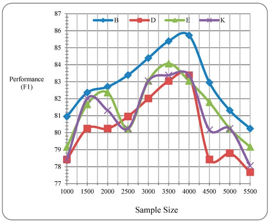 Table 4 show that the highest performance is obtained with the integrated model when sample size is 4000 with f-measure performances of 85.72%, 83.38%, 83.04%, and 85.72% on Books B, DVDs D, Electronics E, and Kitchen Appliances K respectively. These results are significantly better than that of the best baseline models (voting ensemble classifier) with f-measure performances of 76.54%, 75%, 73.42%, and 76.92% on Books B, DVDs D, Electronics E, and Kitchen Appliances K respectively.