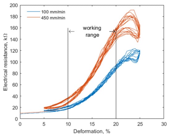 Textile sensor response for dynamic load at 100 and 450 mm/min deformation speed.