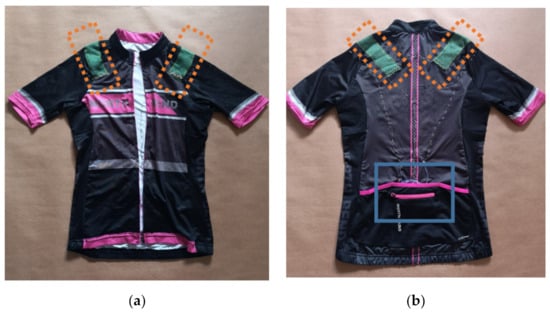 The Double Aid (DAid) smart shirt system ((a) front and (b) back) with a textile stretch sensor on each shoulder (marked by the dashed lines); the pocket on the back (marked by the blue line) is used for the data acquisition module.