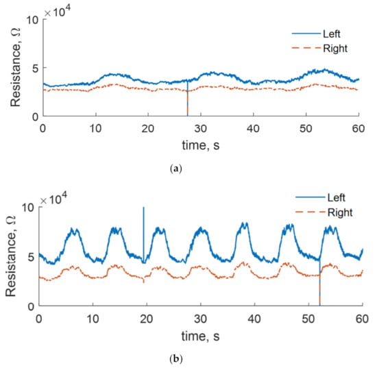 During the first visit, the patients, who agreed to be included in the DAid smart shirt test group, were informed about the nature of the study and were instructed on the proper procedure of application of the smart garment during the training. The DAid system was put over the clothes of the patient, and a laptop was positioned in a comfortable height and position in front of the patient. The real-time reading from both sensors was provided to the patient in form of a graph on the computer screen (see Figure 4), and the participant was instructed to perform each exercise while actively trying to keep the sensor reading as even as possible. This could be achieved only through holding the shoulders immobile, as any shoulder motion would deform the shirt fabric and thus be visible on the screen as a change of sensor reading. In a perfect situation, performing an exercise with no motion of the shoulders would result in a close to a flat line on the sensor response, as the sensors would not be deformed. In most cases, patients are unable to perform the movement perfectly, resulting in a periodically changing value of the measured sensor resistance as the exercise is performed. Considering that the exercises in most cases were lifting and lowering one or both arms in a specific manner, the sensors were stretched and released periodically. Consequently, the relative change of the sensor value described the quality of the performed exercise (Figure 5). The patients were instructed to try to keep the change as low as possible. This forced the patients to pay more attention to the stability of the shoulder. The participants were under constant supervision of the physiotherapist.