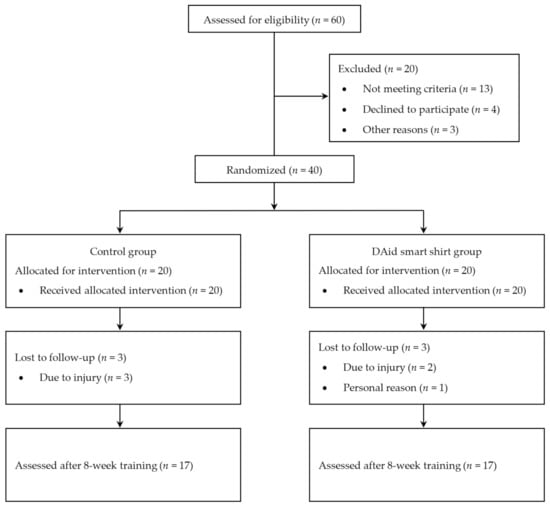 Between January 2019 and January 2020, 60 patients with a diagnosis of primary subacromial pain syndrome (SAPS) were assessed for eligibility. The eligibility assessment was performed according to the Consolidated Standards of Reporting Trials (CONSORT) flow diagram, as presented in Figure 6. In total 40 participants met the inclusion criteria, of these 20 were assigned to the DAid smart shirt trial group and 20 to the control group. Six participants (three from each group) withdrew from the trial for various reasons, mostly (5/6) due to an injury, which prevented further participation in the training for a significant period. Complete test results for 34 participants were included in the statistical analysis.