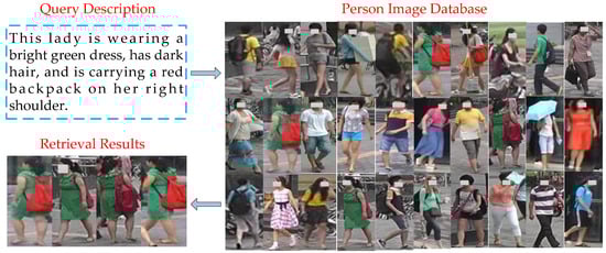 TBPS can be classified into two classes: Attribute and natural language. Attribute-based person search involves searching for a person with certain attributes in the database [,,], such as wearing a red t-shirt, etc. This method needs a set of predefined semantic attributes to describe the appearance of person, and the ability of attributes to describe the appearance of person is limited. It is also very expensive to mark attributes for large-scale person image datasets. Because of the low-dimensional feature of person attributes, the results of attribute-based person search are often not satisfactory. A person search based on natural language refers to searching the closest person image in large-scale video surveillance dataset through a language description given by the witness [,,], as shown in Figure 1. The description of witness is often a natural language description rather than discrete attributes. Natural language is able to represent the appearance details of person more accurately than the attributes, and can provide more semantic information for person search. Therefore, this paper studies person search tasks based on natural language query description.