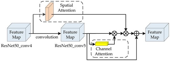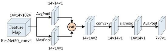 The structure of our SAM is illustrated as Figure 3. The channel dimension of the input feature map (extracted from conv4 layer of ResNet50) was handled with max pooling and average pooling, respectively, and two feature maps with channel dimension of 1 were obtained. Then, the two feature maps were concatenated to one feature map, and the feature map was reduced to one channel through the 3 × 3 convolution operation. Then, the attention map based on spatial location was generated using the sigmiod function. Then, the attention map was subsampled, and its height and width were half of the previous one. The final spatial attention feature map can be acquired through the multiplication of the spatial attention map and the output of channel attention feature map based on the conv5 layer of ResNet50. The calculation of spatial attention map is shown in Formula (1):