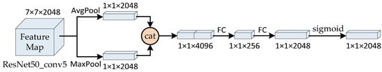 The structure of CAM is illustrated as Figure 4. The input feature map (extracted from the conv5 layer of ResNet50) was handled with max pooling and average pooling, respectively, to obtain two feature maps with height and width are 1. Then, the two feature maps were concatenated and connected with two layers of fully connected network, and then the attention map based on channel dimension was generated using the sigmiod function. The final channel attention feature map was generated through the multiplication of the channel attention map and the input feature map. The calculation of channel attention map is shown in Formula (2):
