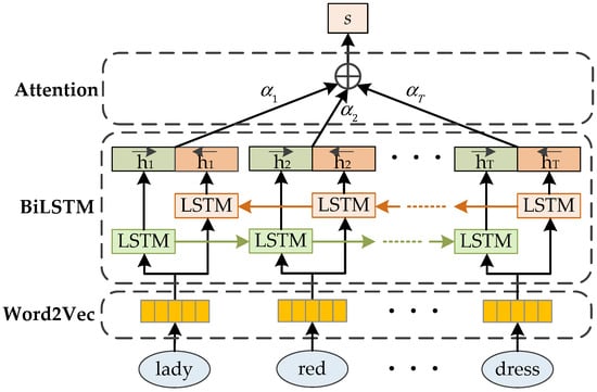 Although LSTM can solve the two main issues of RNN, LSTM can only learn the preceding information of the text and cannot use the following information of the text. However, in the language description of persons, the semantics of a word is closely relevant to both the preceding information and the following information. Therefore, using bidirectional LSTM (BiLSTM) [,] replaces LSTM and introduces the following information in the description, and can better capture bidirectional semantic dependency and improve the accuracy of prediction. BiLSTM is composed of two stacked LSTM networks, forward and backward, which capture the effective information of the preceding and the following, respectively, and then concatenate the two hidden states to form the final output. The BiLSTM network structure is shown in Figure 6.