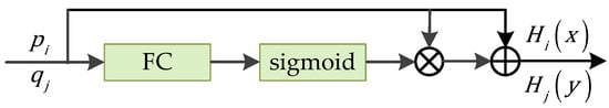 The structure of cross-modal attention mechanism (CMAM). and are the input features of CMAM for image subnetwork and text subnetwork, and are the output features respectively, FC denotes full connection layer, denotes element-wise product, and denotes element-wise sum.