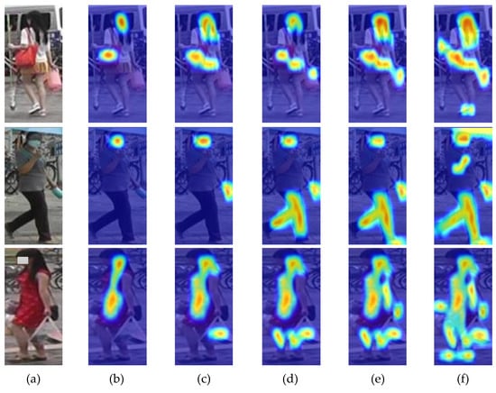 Examples of heat maps of different mechanisms. (a) Original person image; (b) ResNet50 without attention mechanism; (c) ResNet50 + SA; (d) ResNet50 + CA; (e) ResNet50 + SA + CA; (f) ResNet50 + cubic attention.