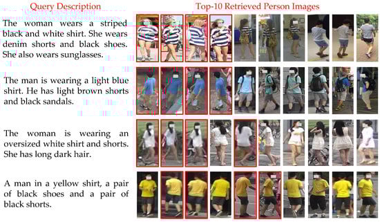 Figure 9 illustrates some examples of language-based person search results using our approach on the CUHK-PEDES [] dataset, where the red boxes indicate that the correct person images were searched. The first three rows in the figure show that our method can accurately learn the cross-modal correlation between the key appearance features described in the language descriptions and the images, and can search for the correct person images according to the appearance language descriptions. The result proves the effectiveness of the approach. The last row exposes an example of top-1 failure due to the high similarity of other person’s images and the description. However, it can be observed that the true matching images are still in the top positions in search ranking, which shows that our method has good robustness.