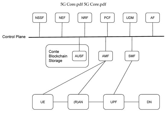 A logical representation of 5G network functions, with a single function (AUSF) being decentralized by using Conte blockchain storage.
