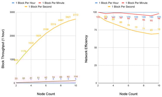 Performance and scalability of Conte at 15,000 km node distances and maximum hops to graph edge of 10. Block Throughput (left) and Network Efficiency (right).
