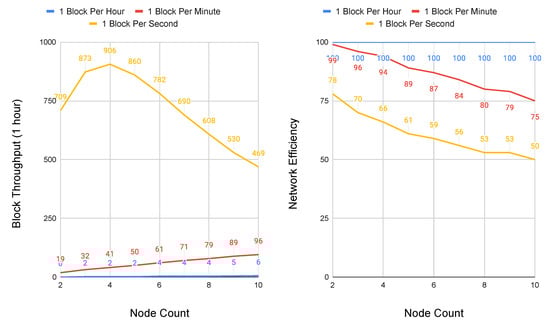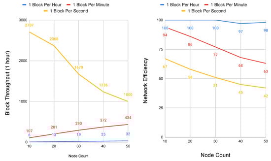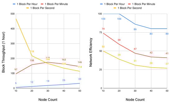 Increasing node sizes to 50 at 1500 km (Figure 8) shows marginal impact at block rates of one per hour, while network efficiency begins to fall sooner, seeing reductions at the 1 block per minute transmission rate that was previously little impacted at smaller node sizes. It is important to note that overall throughput does continue to improve, and remains above the peak of the initial simulation set which capped node sizes at 10. With one block per second rates at 1500 km, we see the system become overwhelmed with block throughput dropping sharply, having a throughput rate at 50 nodes that is below that of a system having only three in the first simulation.