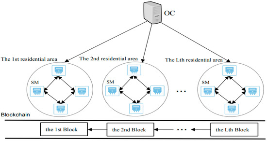 - Smart meter (SM). A SM is an electricity meter for each user’s site in the residential area. The smart meter regularly and simultaneously (e.g., every 15 min) collects the power consumption data of each user’s household electrical equipment. Peer-to-peer (P2P) communication is used between all SMs in each residential area. Each residential area uses leader election algorithm to select a smart meter from the smart meters as the mining node (MN), then each residential area constructs a block through a MN. The MN selected by the MN selection algorithm can replace a trusted third party or a trusted authority, it is responsible for generating system parameters, authenticates the legitimacy of the data transmitted by the smart meter, and aggregates the encrypted data. Then, SM encrypts all kinds of collected data and uploads it to the MN after a short period of time. SM is assumed to be honest-but-curious, which executes the operations according the protocol without launching the active attack. However, it perhaps tries to analyze the received data to infer some valuable information.