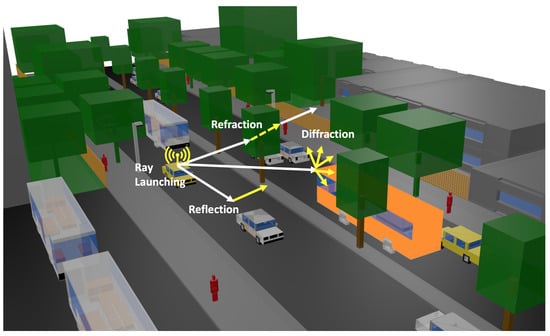 The launching rays are predefined in a solid angle that considers the radiation diagram of the transceivers. Parameters such as frequency of operation, radiation patterns of the antennas, number of multipath reflections, separation angle between rays, and cuboid dimension can be considered to be inputs in the 3D-RL software. Moreover, all the material properties for all the elements within the scenario can also be considered, given the conductivity and relative permittivity of all the obstacles at the frequency range of the system operation under analysis. Figure 2 presents a schematic overview of the 3D-RL principle in the considered scenario, where reflection, refraction and diffraction are depicted in the vehicular scenario. The detail of the different sizes of vehicles can also be observed.