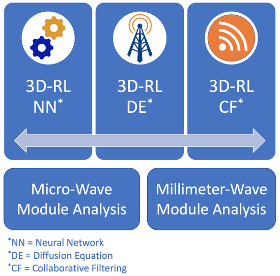 As presented in the literature, the principle of GO/UTD foresees precisely wireless communication propagation when a complex 3D scenario is considered [60], with the principal disadvantage of a high computational cost. In this sense, in order to overcome this drawback, different hybrid techniques have been proposed combining the 3D-RL algorithm with different approaches, such as Neural Networks (NN) [61], Diffusion Equation (DE) [62] or Collaborative Filtering (CF) [63]. These hybrid techniques achieve accurate results while reducing the computational cost for complex scenarios. The 3D-RL tool is based on a modular structure, where different libraries can be integrated. Thus, to consider the frequency band of 28 GHz, the 3D-RL tool has been updated with the mmWave module. Figure 3 presents the schematic view of the in-house developed simulation algorithm for propagation prediction at micro-wave and mmWave frequency bands, integrated with the different hybrid techniques to reduce the computational load for complex scenarios.