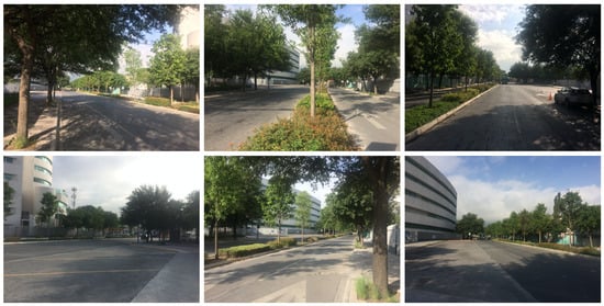 In this section, the real scenario used to model vehicular communication links through the 3D-RL algorithm is described as well as its rendered schematic view used for simulation. Figure 4 presents a collage of photos of the real scenario, located in a side street of Tecnológico de Monterrey, Campus Monterrey, Mexico. As depicted, the modeled fragment corresponds to an area of approximately 150 × 68 m with several types of vegetation, such as different trees and shrubbery. The portion corresponding to the avenue occupied by the vehicles has a length of 150 m and a width of 16.5 m, where a median strip with inhomogeneous vegetation and two lanes per driving direction are included, representing a classical urban complex heterogeneous vehicular scenario. Moreover, abundant vegetation, private fences and buildings with one to eight floors are surrounding the delimited segment area.