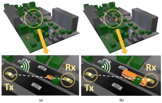 - Guan, K.; Ai, B.; He, D.; Matolak, D.W.; Wang, Q.; Zhong, Z.; Kurner, T. Obstructed vehicle-to-vehicle channel modeling for intelligent vehicular communications. In Proceedings of the 2018 IEEE Global Conference on Signal and Information Processing (GlobalSIP), Anaheim, CA, USA, 26–29 November 2018. [Google Scholar]