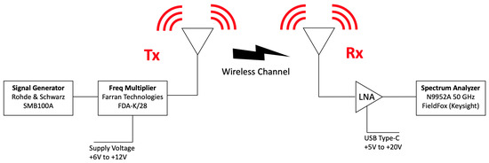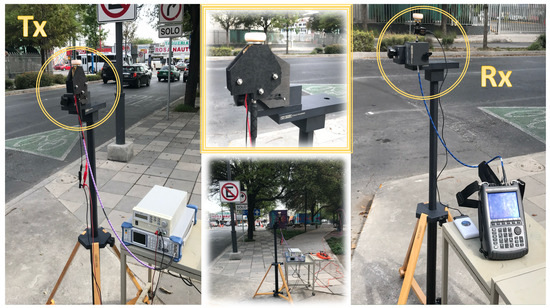An experimental campaign of measurements has been performed in the real scenario located in Monterrey, Mexico, to validate the proposed simulation algorithm. Figure 6 presents the schematic view of the deployed equipment. For the transmitting part, a signal generator SMB100A from Rohde & Schwarz up to 20 GHz has been used. A frequency multiplier FDA-K/28 from Farran Technologies has been connected to the signal generator to increase the transmitted signal up to 28 GHz. Then, a Ka-band omnidirectional antenna Model SAO-2734030345-KF-S1, from SAGE Millimeter, Inc. has been used. For the receiving part, a Ka-band omnidirectional antenna has been used, Model SAO-2734033045-KF-C1-BL from SAGE Millimeter, Inc., equipped with a low noise amplifier (LNA) of 30 dBi. Finally, the received power has been measured with a portable spectrum analyzer N9952A 50 GHZ FieldFox from Keysight Technologies. A collage with real pictures of the scenario, with the deployment of the employed equipment, as well as the surroundings of the considered scenario can be seen in Figure 7. The transmitter and receiver antennas have been placed at 1.5 m height with the aid of a tripod constructed from wood and nylon materials (AT-812 Antenna Tripod from Com-Power Corporation).