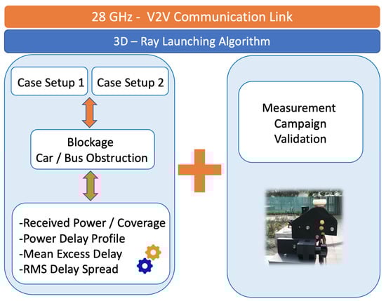 The following section presents the simulation results performed with the in-house 3D-RL software. As stated before, the simulated scenarios correspond to a typical urban environment and links with the obstruction by small and large vehicles (car and bus obstruction, respectively). The analysis of the received power, the Power Delay Profile (PDP), and temporal dispersion parameters such as the Mean Excess Delay (MED) and the Root-mean-squared Delay Spread (RMS DS) are shown. Figure 9 presents a schematic diagram of the 28 GHz vehicular communication link analysis presented in this work.
