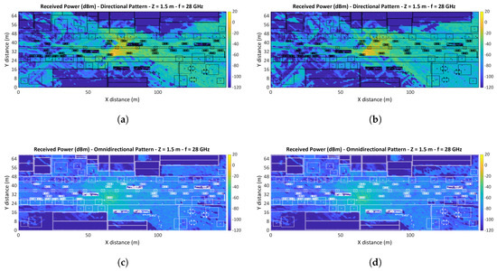 All the received power levels in dBm for the complete volume of the scenario have been collected using the in-house 3D-RL simulation tool. Figure 10 shows the horizontal planes at a height of 1.5 m for every combination (directional/omnidirectional antennas radiation pattern and car/bus link obstruction in V2V communication). Please note that the values of received power for different antennas radiation patterns planes cannot be compared to each other in numerical terms since the antenna gain differs from each other.