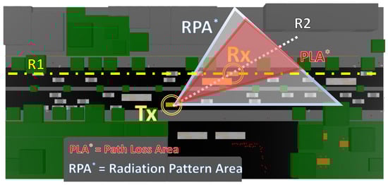 The use of spatial techniques such as beamforming and the application of MIMO systems promise to increase communication ranges at mmWave frequencies. Figure 10a,b shows the simulation of a V2V communication using a directional antenna. Although other areas receive useful signal power due to effects such as signal reflection and diffraction, the area of interest is limited. Connection throughout directional radiation patterns employs target tracking to establish communication. In this aspect, the main region of concern is the directional radiation pattern area (RPA) of the transmitter (see Figure 11 for reference). In this reception area, the approximate coverage, taking into account both the avenue and the sidewalk, is 99.6% in the case of the obstruction by a regular vehicle and 98% in the case of the obstruction by the bus. The reduction is linked to the shadowing by the bus, with a complete loss of the signal inside the vehicle. Thus, reinforcing the conclusion that communication in mmWave frequency bands are strongly affected by blockage.