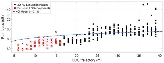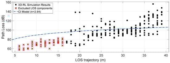 To compare with related work in the literature, a study carried out by Longhe Wang et al. [44] based on the characterization of the wireless channel in a V2I scenario, has been considered. The work analyzes different scenarios, where the fitted values for a CI free-space model are obtained in terms of its PLE and shadow fading (). Using the PLE n = 1.98 and a dB, which is the best fit determined in their investigation for the LOS cases, the received signal power estimation is plotted in Figure 16 following the CI free-space model. The RMSE of this estimate is 5.02 dB, an error greater than that of the 3D-RL simulation presented in this work. This shows the close relationship of the PLE and the with the specific environment that it intends to estimate. The scenario in which the measurements and the 3D-RL simulation occur presents a favorable environment to the wave propagation, with abundant scatterers on both sides of the LOS path. Large metal elements are also on the sides, influencing better signal reception throughout the path. As a result, the use of PLE based on generic scenarios can lead to estimation errors, while deterministic simulations such as RL can better demonstrate the phenomena that characterize a given scenario.