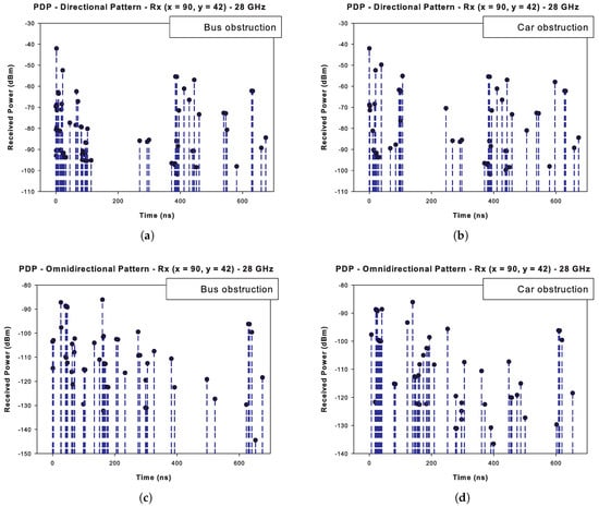 As stated, the omnidirectional antenna transmission is simulated with lower gain power than the directional pattern. Figure 14c shows the PDP when a large vehicle (bus) is found in the LOS path between the transceivers. It is noteworthy that some of the first resolvable paths are heavily affected compared to their counterpart (Figure 14d), a small vehicle (car). This is closely related to the poor penetration of signals at mmWave frequencies bands. The decrease in received power of some of the first-order resolvable paths is especially notable. This corresponds to rays of shorter paths travel distances, consequently strongly affected by the obstruction. The rest of the multipath components are less affected as they are related to high delays and, consequently, greater distances traveled, thus possibly being related to paths away from the obstruction.