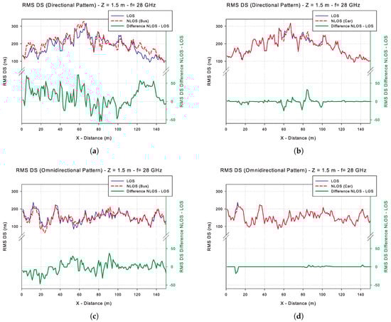 RMS DS simulation results for a radial R2 in the receiver trajectory: (a) Directional radiation antenna pattern and bus obstruction, (b) Directional radiation antenna pattern and car obstruction, (c) Omnidirectional radiation antenna pattern and bus obstruction, (d) Omnidirectional radiation antenna pattern and car obstruction.