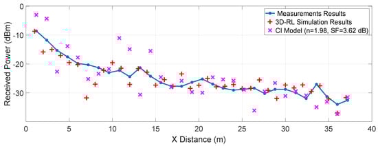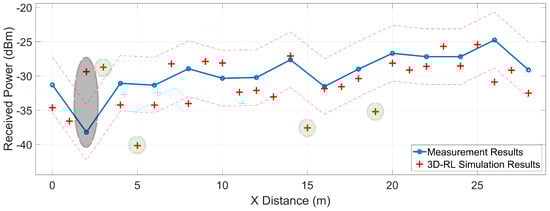 To validate previous simulation results, several measurement points were collected in the real scenario presented in the Section 3.3, with the previous explained deployed equipment. Figure 16 exhibits the results gathered throughout the measurements campaign, in markers from to as represented by the layout in Figure 8. The empirical data is represented in circles joined by linear interpolation, where every point is spaced by 1.2 meters, starting from 1.2 to 37.2 m in the x-axis. The 3D-RL results of the simulation carried out on the virtual stage, under the conditions of the measurement campaign, are illustrated in the same figure by red “+” symbols. The root-mean-square error (RMSE) between measurements and simulation is 2.91 dB, showing good agreement between simulations and the empirical data.