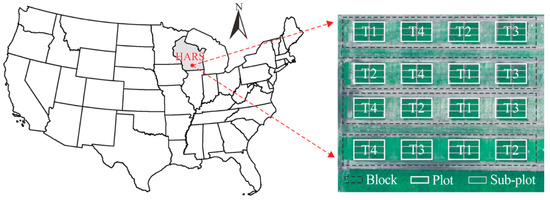 The field experiments were conducted at the University of Wisconsin Hancock Agricultural Research Station (HARS) under a Variable Rate Irrigation (VRI) system in Hancock, WI, USA (Figure 1) in the 2019 growing season. Wisconsin is located in the Great Lakes region which is in the north-central part of the United States, and Hancock is located in central Wisconsin. In 2019, Hancock experienced a typical humid continental climate with an average 23 °C daytime temperature and 12 °C nighttime temperature during the growing season from late April to early September [27]. The monthly total precipitation was the highest at 18 cm in July and the lowest at 7 cm in August.